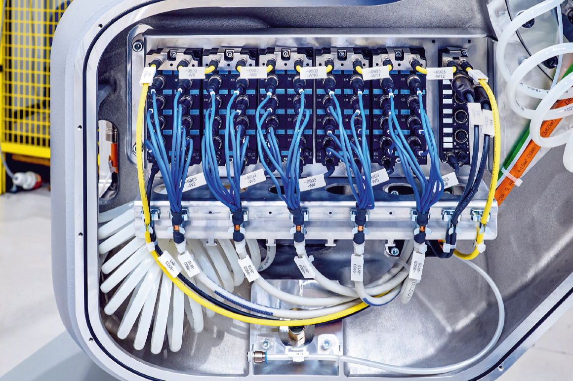 确保信号采集可靠性的技术难点在于找到一种抗扭转、带屏蔽功能且纤细的电缆,以适应机器人内部安装需求。此外,所需的八个 M12 连接器必须与电缆实现防水连接。倍福针对这一需求,研发处一套极具创新的解决方案:采用单股线缆单独注塑成型工艺连接到 M12 连接器上。这种定制化线束注塑成型技术打造出特别节省空间的 IP65/IP67 级传感器电缆,与系统紧凑的结构完美契合。Bernd Käsmann 证实道:“与倍福共同研发的解决方案旨在将八个通道集成在一根电缆中,以节约安装空间。其它重要考量包括 EMC 屏蔽、双绞线设计、最小化线径、确保 IP 防护的注塑接头、传感器接线板,以及可实现快速布线的双侧装配结构。”无需拆解机器人即可便捷检修,以及提供全规格配置和长度的电缆供应也同样至关重要。目前尚无其他供应商能完整实现所有这些技术要求。