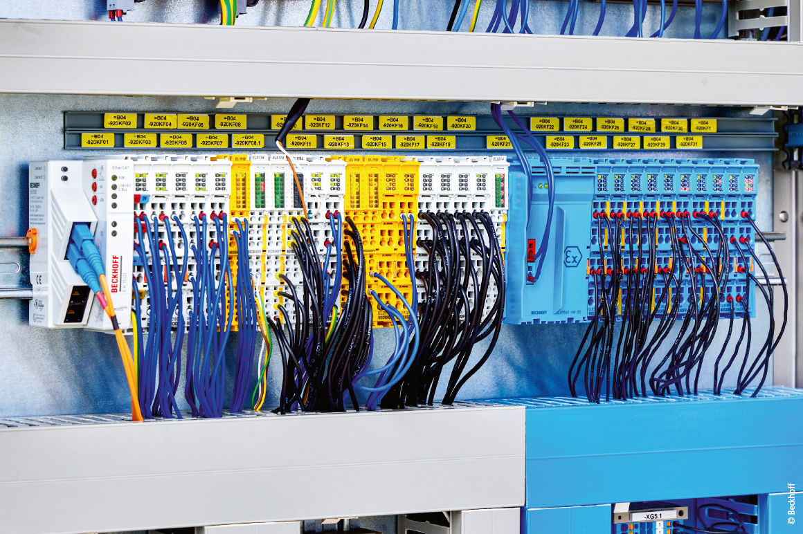 此外,还通过 TwinSAFE SC 和 TwinSAFE 端子模块实现了多项安全功能。“总计约 40 项安全功能(其中部分符合 SIL2 安全等级)基于 IEC 61511 标准实施。”Iesse Schneider 表示。EtherCAT 和 Safety over EtherCAT 在此发挥了重要作用。初始方案是采用一个配备 TwinSAFE 逻辑的 TwinSAFE 端子模块 EL1918 作为安全控制器。但由于该端子模块最多支持 512 个功能块,无法覆盖工厂全部安全需求,最终将超过 700 个的功能块分配至四个 EL1918 端子模块。这些端子模块通过 FSoE 接收传感器和执行器信息,并实现相互通信。