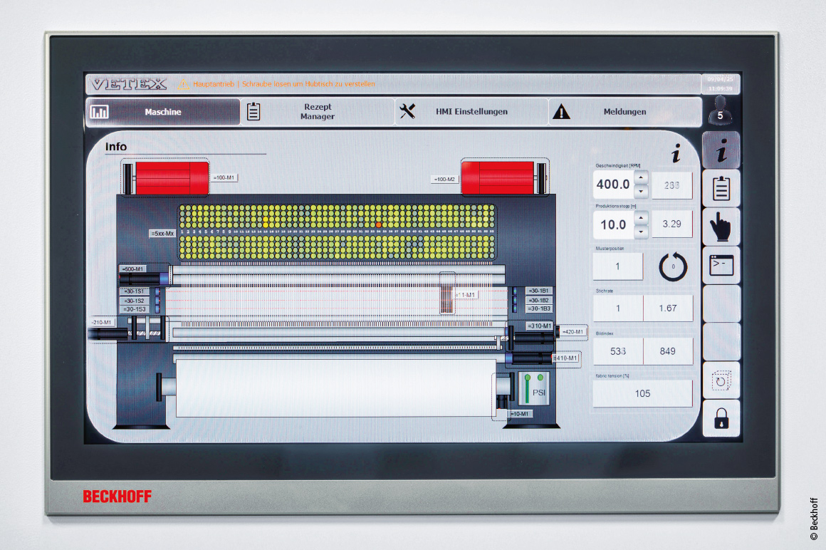 基于 PC 的控制系统通过电机电流或产生的扭矩来调节纱线张力,并能够检测张力过高或断线情况。“这两者都会直接影响地毯品质。”Josef Röttgers 说道。纱线张力通过点阵图在 CP2918 控制面板上显示给设备操作人员。“操作人员可通过颜色变化立即定位纱线送料卡顿位置,并在必要时及时进行干预。”Jens Hülsebusch 说道。为确保显示与设备运行周期同步,可视化界面由 TwinCAT 3 PLC HMI (TF1800) 创建。