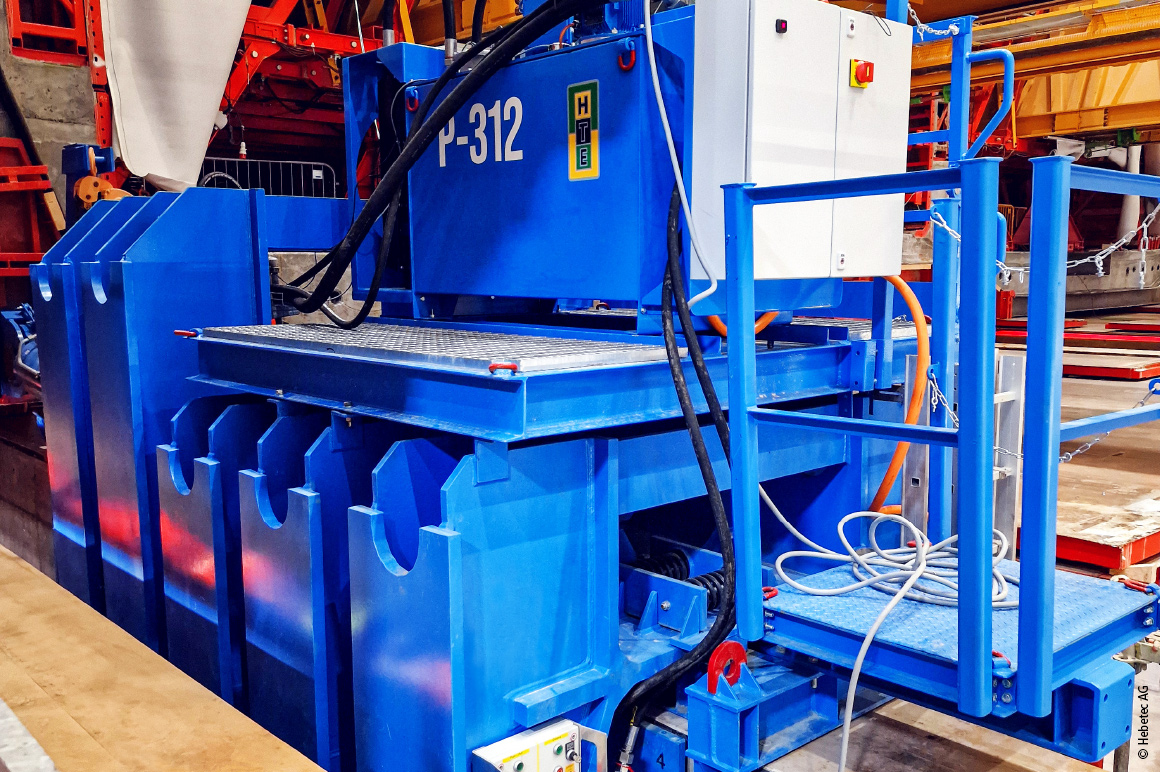 在整个流程中,巨型隧道管节通过液压支架调平后,由液压千斤顶向前推移数百米。该方案由瑞士欣德尔班克的 Hebetec 公司研发,并与位于基尔希贝格的倍福解决方案供应商 Elpex 公司合作实现自动化。“将最终长达 200 余米、宽 43 米的管节安全、精确地从混凝土浇筑车间移运至港池,是一项真正的挑战。”Hebetec 公司运营总监 Olivier Briguet 强调道。每条生产线由六个行程达 1.8 米的双液压缸驱动,这些液压缸安装在可移动框架上,通过夹爪紧贴在滑移梁侧面。六个液压千斤顶均匀地向前推进管节,随后松开夹紧装置并回缩,在此过程中被向前牵引,继而开启新一轮循环作业。
