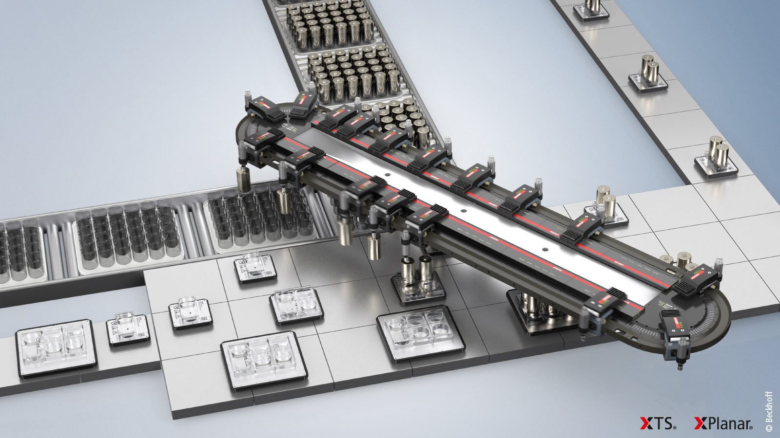 基于 PC 的控制技术不仅能够实现极高的效率和速度,还能够彻底改变传统的生产方式,实现全新的生产方案。例如,高性能工业 PC 可用于控制倍福的 XTS 和 XPlanar 智能输送系统,实现个性化的电芯输送:在输送电芯时,动子既可沿着线性输送轨道进行输送,也可通过悬浮在专用的平面模块上进行平面输送。这些个性化的输送路线显著减少了系统的占地面积,最大限度地提高了生产的灵活性,并实现了持续、无缝的产品跟踪。