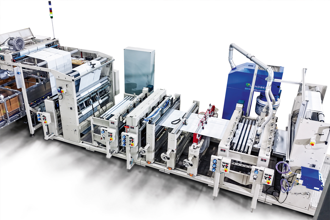 在全新优化的薄膜转换工艺中,1400-GEC 机器展开两卷薄膜,并在这两卷薄膜上进行套印,并采用连续纵向热封。然后,薄膜卷将通过一系列横向冲压成型和热封工序,根据订单需求将材料切割成 1 至 5 条独立的包装袋通道,并添加易撕口设计以方便分离。在将成品包装袋装箱前,系统会根据客户指定的使用规范,执行视觉检测程序:在包装袋内注入空气,并测量其形状轮廓。