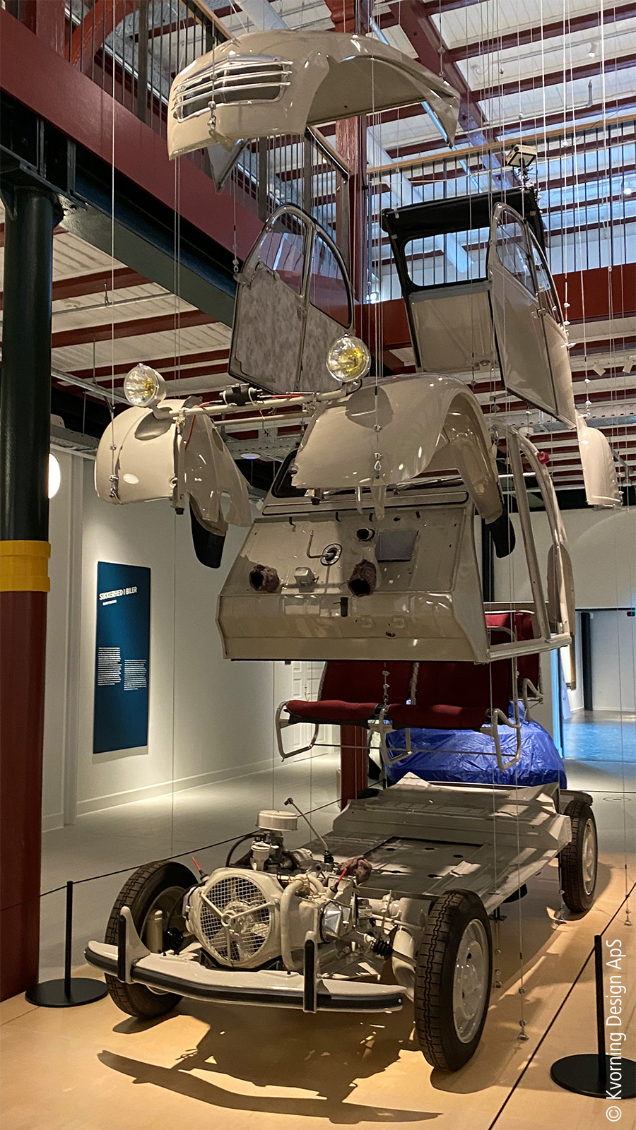 该装置的创意和设计均来自 Kvorning Design ApS 公司,他们是一家蜚声国际的展览和体验设计公司,长期以来一直协助老爷车之家完成所有展览和特效设计。其中包括最新的令人印象深刻的“飞行的 2CV”展品,其背后涉及到的安装和控制工作一点也不简单。屋顶安装的驱动装置不仅需要同时升降多个重达 100 公斤的汽车部件,还需要在保持安静的情况下可靠、精准地运行。
