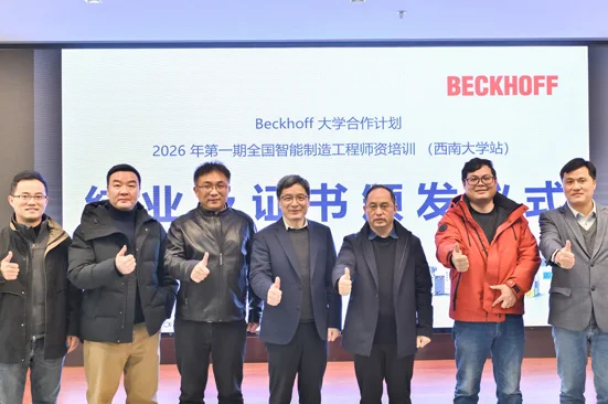 2026 年 1 月 16 日,Beckhoff 大学合作计划 | 2026 年第一期师资培训班(西南大学站)结业及证书颁发仪式在西南大学工程技术学院工科实验大楼隆重举行。西南大学研究生院副院长李云伍、苏州工学院电气与自动化工程学院副院长陈景波,倍福中国自动化有限公司西南区销售经理陈怀斌、重庆区域销售经理颜胜波、客户经理郑海峰等领导、嘉宾出席仪式,仪式由西南大学工程技术学院工程实验教学中心主任丁珠玉主持。