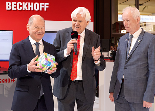 2025 年 3 月 31 日,德国总理奥拉夫·朔尔茨出席了 2025 德国汉诺威国际工业博览会开幕式,并参观了总部位于威尔的 Beckhoff Automation 展台。德国总理此行由加拿大欧盟及欧洲事务特别代表斯特凡·迪翁陪同,加拿大是今年汉诺威工业博览会的主宾国。倍福全球总裁 Hans Beckhoff 向总理一行介绍了倍福公司基本情况及公司在工业软件和人工智能领域的技术积淀。