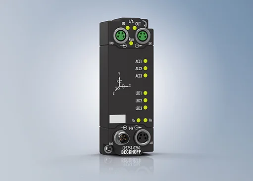 倍福 EtherCAT 端子盒 EP3751-0260集加速度传感器和惯性传感器(IMU,即陀螺仪)于一体。此款端子盒外观精巧,尺寸仅为 30 x 86 x 22 mm,能够检测和测量冲击、振动、加速度以及旋转运动。端子盒既可直接提供原始传感器数据,也可对测量数据进行预处理。