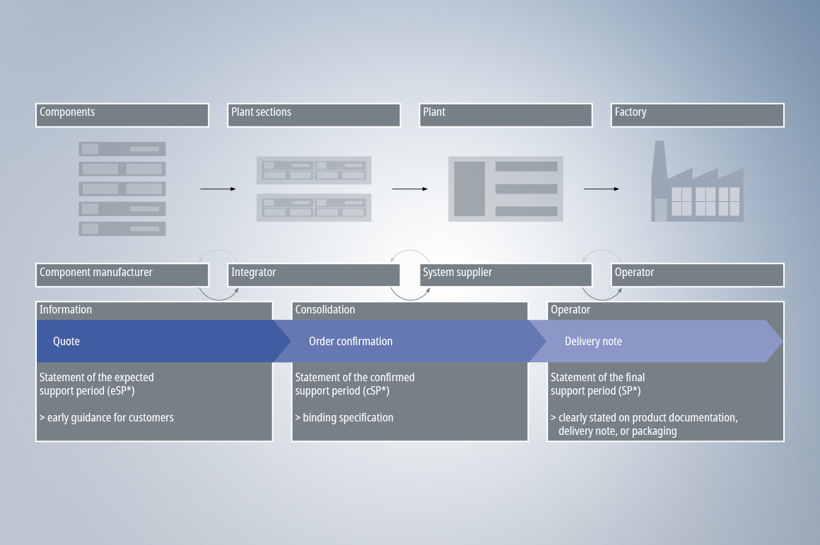 A particular level of organizational effort may be required if a machine or system can only be offered or confirmed with a specific support period once reliable information is provided from the supply chain: for example, in the form of quotations with confirmed support periods for supplied components with a core function.