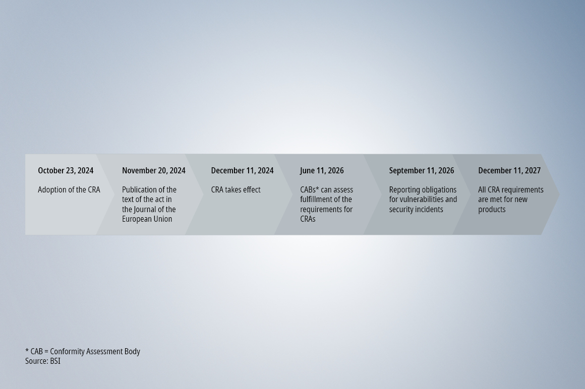 The Cyber Resilience Act came into force back in November 2024 and has applied in all EU member states since then. While EU directives such as the NIS2 Directive first need to be transposed into the national law of the EU member states in order to take effect, regulations such as the Cyber Resilience Act come into force immediately after adoption by the European Parliament and the Council of the European Union. In other words, they do not need to be transposed into national law. In the case of the CRA, however, the requirements are being introduced gradually.