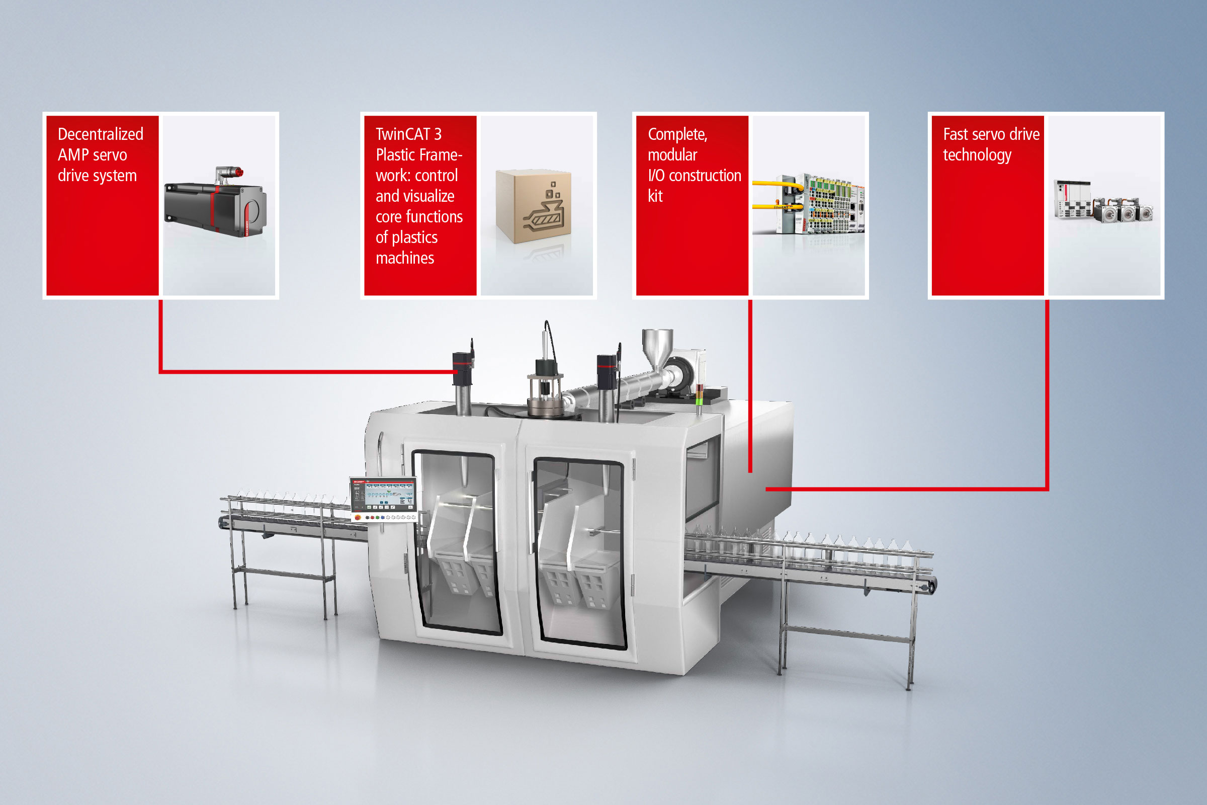 倍福可为采用任何大小的液压或电动组件的挤出吹塑机提供软硬件控制产品,从简单的单个挤出头应用到复杂的多层共挤吹塑系统: