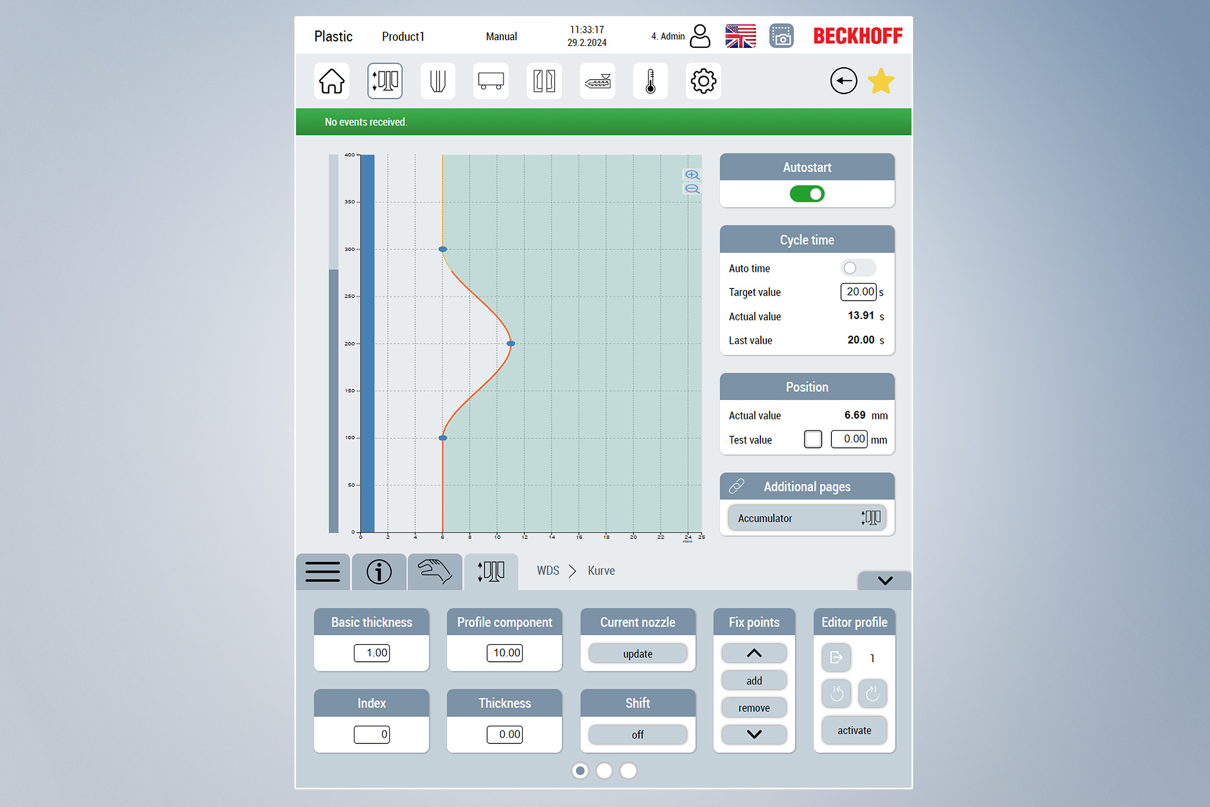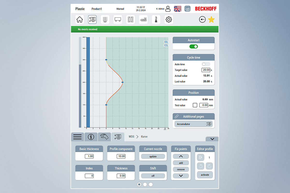 TwinCAT 3 Plastic Framework 包含三个软件库:TF8540 用于实现塑料加工中基于软件的全面温度控制。TF8560 软件包提供所有塑料机械运动控制功能组件。TF8550 是专门为塑料行业开发的 HMI 软件包,能够以极少的工程工作量实现典型工艺过程的可视化,并可无缝集成到其它工艺软件包中。