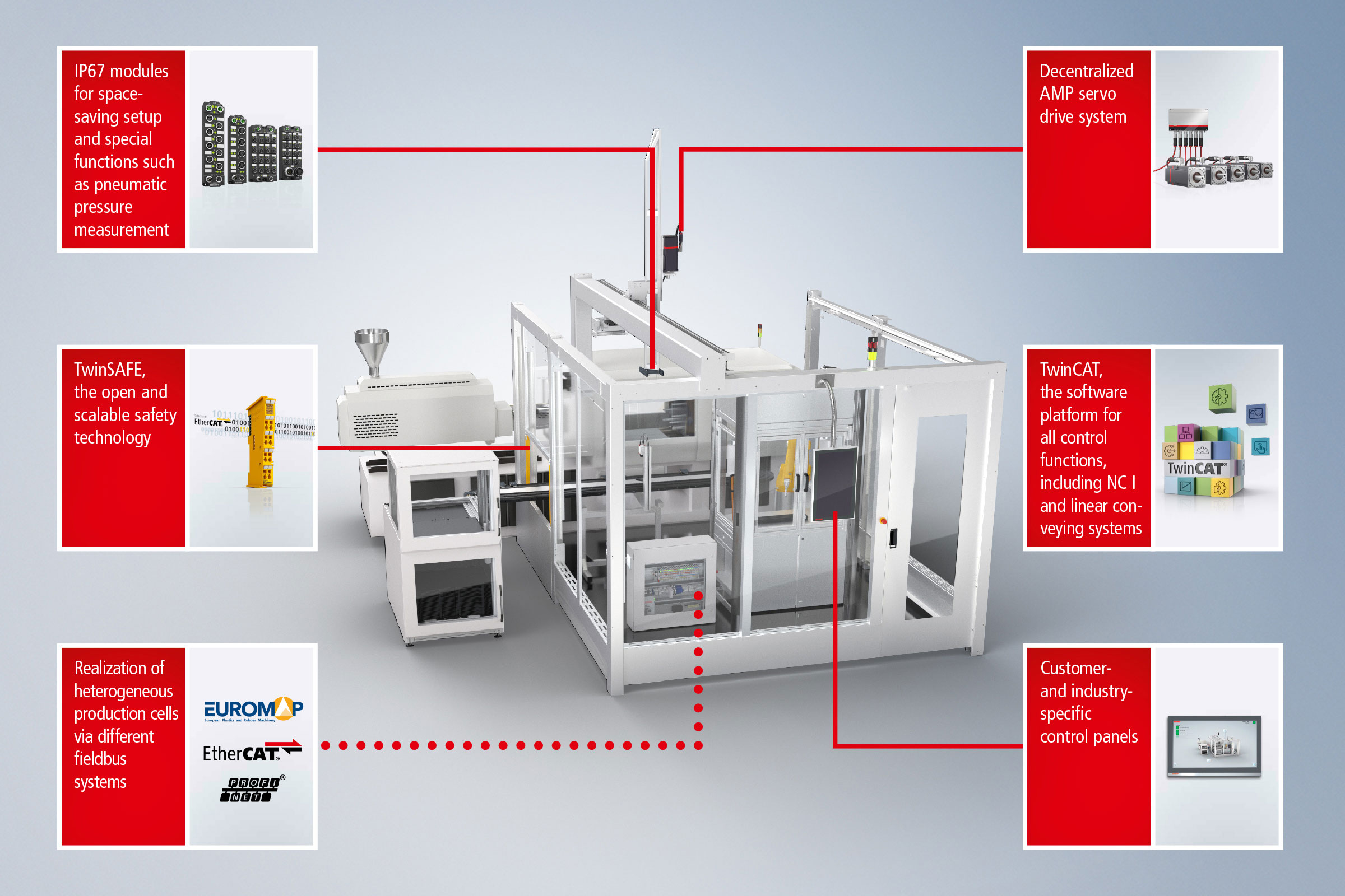 由于它支持基于 OPC UA 且独立于供应商的 Euromap 协议规范,EtherCAT 用作高速现场总线,TwinCAT 用作集成式工程开发平台,因此可以实现各种各样的生产单元设计。