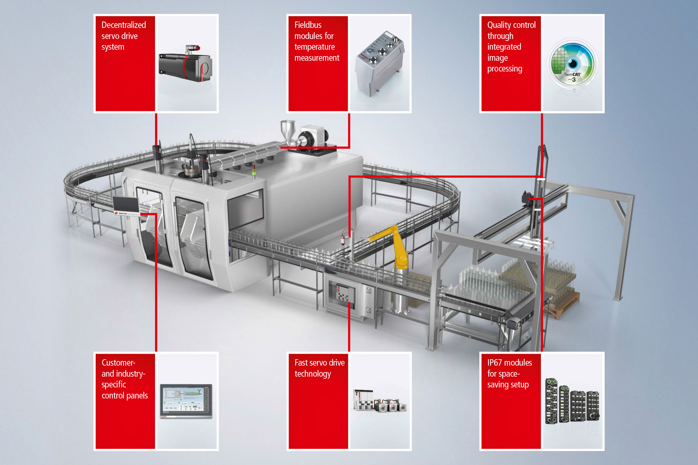 - 除了传统的带齿轮减速机的伺服电机之外,高度灵活的 XTS 和 XPlanar 直线驱动系统还可用于工件输送、堆垛装置或模内贴标(IML)。它们适合用于实现创新的解决方案,例如将产品输送到互联设备的灌装机。