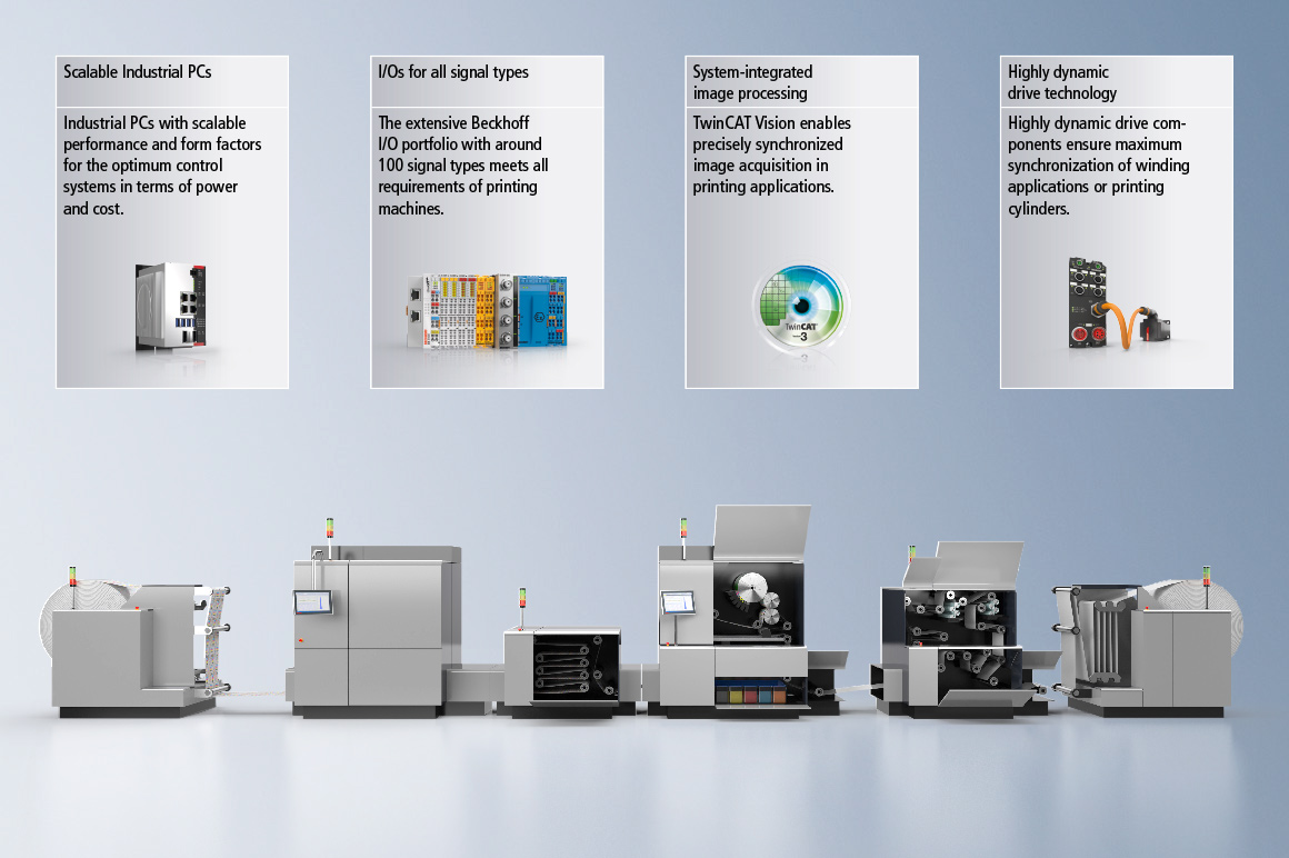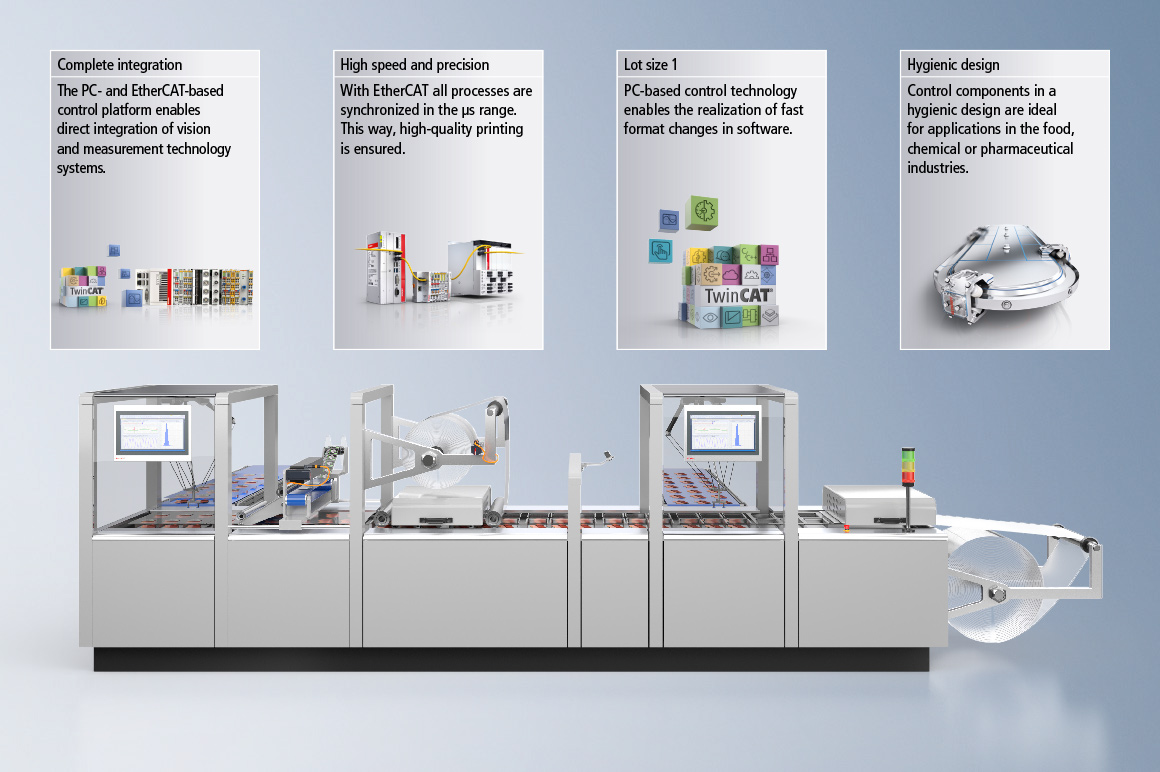 - 全集成:基于 PC 和 EtherCAT 的控制平台可以直接集成技术视觉和测量技术。因此无需使用单独的系统,同步性更强,能够显著提升印刷效率和质量。