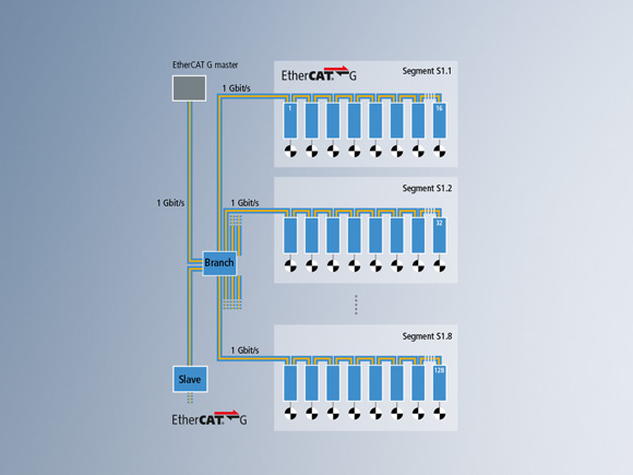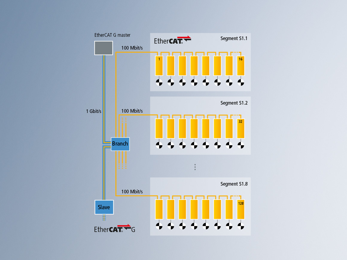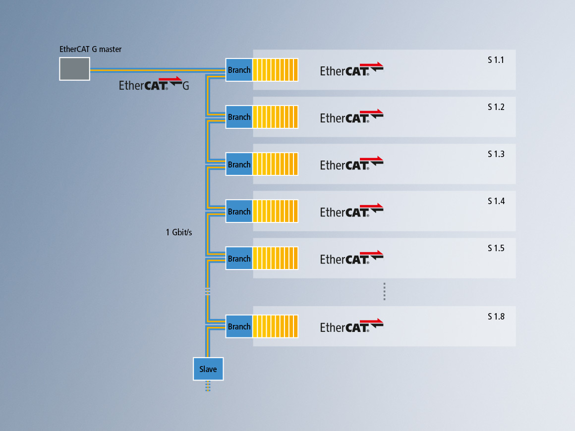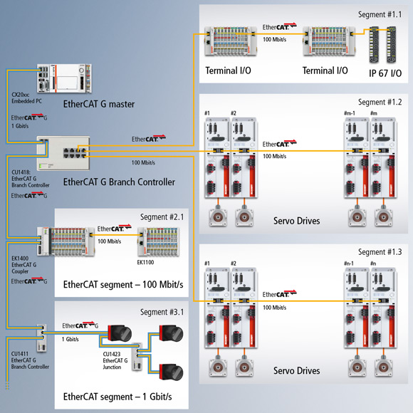 任何配置有标准千兆网口的倍福工业 PC 都可以作为 EtherCAT G 主站。TwinCAT 负责端口控制,对于用户来说,这与之前的应用并没有什么区别。EtherCAT 和 EtherCAT G 通过一个 1 个端口的 CU1411 分支控制器实现互连。分支可以以百兆速率或者千兆速率运行,具体取决于其所连接的设备。
