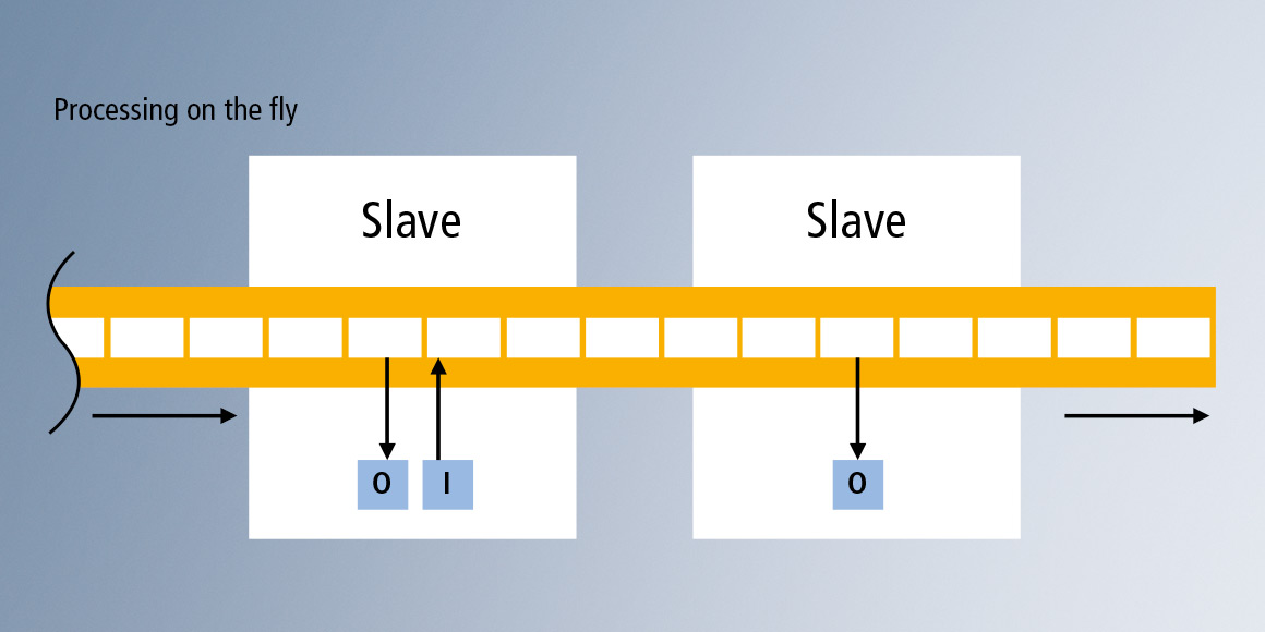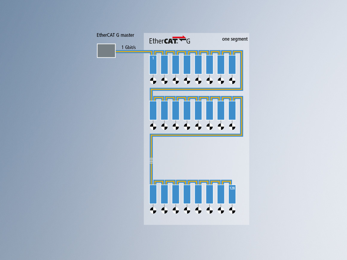 EtherCAT G 基于成功的 EtherCAT 技术运行原理,同时将数据速率提升到 1 Gbit/s 或 10 Gbit/s。EtherCAT 协议本身保持不变,和以前一样,网络中的所有设备都会收到由 EtherCAT 主站发送的报文。每个 EtherCAT 从站都会以“on the fly”的方式读取寻址到该设备的数据,并将其需要交换的数据插入到继续向下游传送的帧中;现在,所有这一切都以 1 Gbit/s 或 10 Gbit/s 的速率进行。硬件产生的延迟是造成报文处理延迟的唯一因素。在子网段中的最后一个设备或者末端分支识别到开放端口时,利用以太网物理层的全双工特性将报文传送回主站。