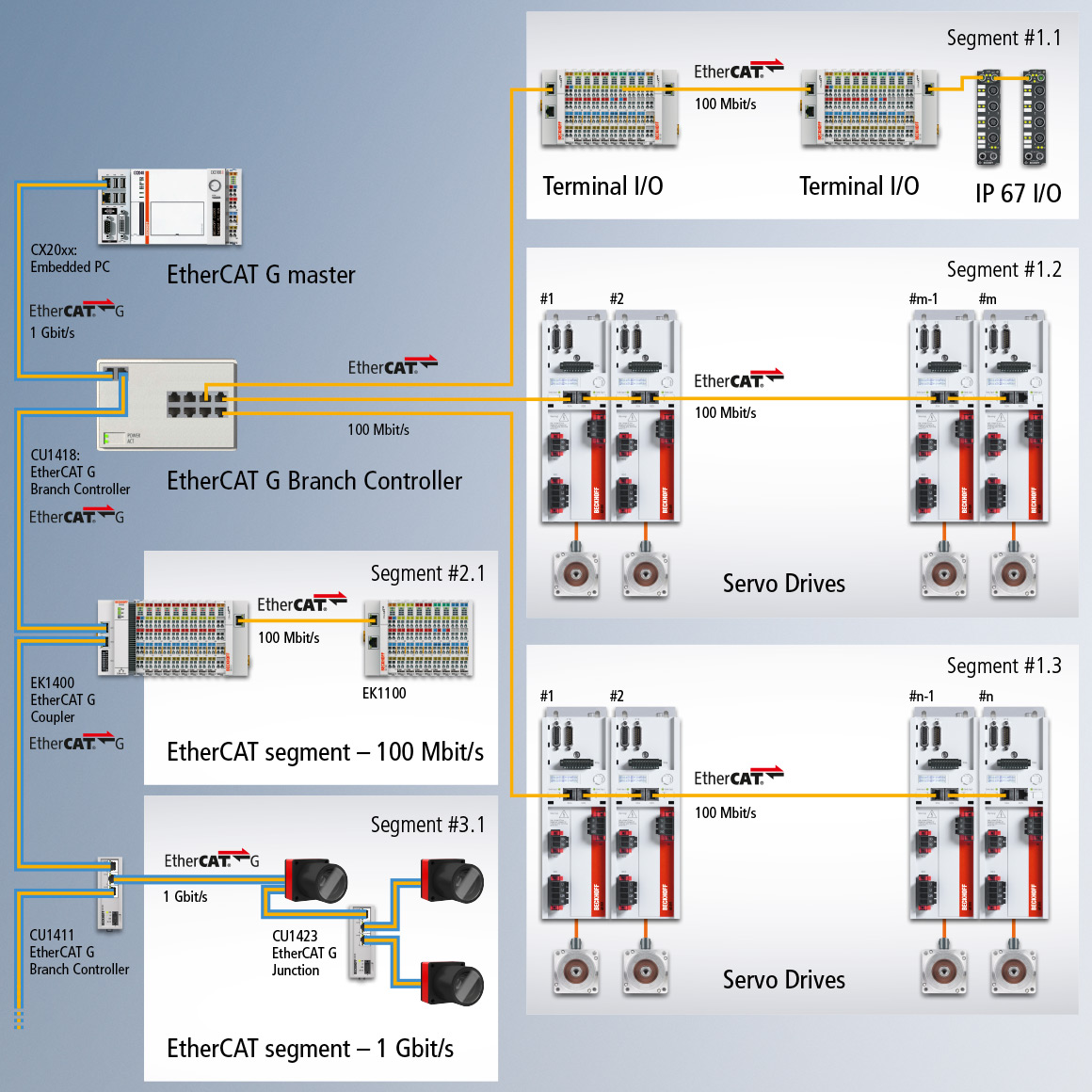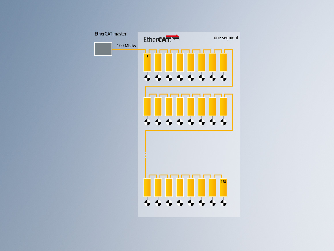 8 端口的分支控制器 CU1418 可以支持更多数量的分支,因此也支持更多种类的拓扑结构。此外,最多可以支持 8 个分支作为独立的 EtherCAT 或者 EtherCAT G 网段运行,并确保即使在连接大量设备下仍然具有较短的循环时间。而 EtherCAT G 拓扑扩展模块 CU1423 被设计为在不改变传输速率的情况下扩展给定网段的网络拓扑结构,它也可以支持没有分支的功能。在搭建一个 EtherCAT G 网络时,可以使用 EtherCAT G 耦合器 EK1400 连接所有倍福的 EtherCAT 端子模块。此外,通过使用 EK1110 扩展模块可以扩展总线节点并作为 EtherCAT 网段独立运行。