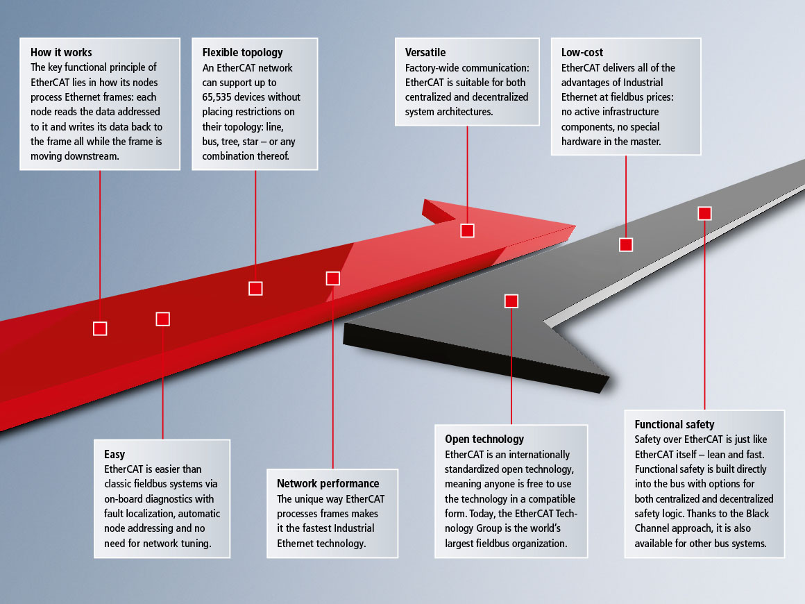 EtherCAT 是迄今为止速度最快的工业以太网技术之一,同时它提供纳秒级精度的同步。所有由总线系统控制或监测的系统应用都将从此大大获益。EtherCAT 系统中设备的快速反应时间减少了处理步骤中的状态转换等待时间,从而显著提高了应用的效率。最后,相对于设定了相同循环时间的其他总线系统,EtherCAT 系统结构通常能减少 25%-30% 的 CPU 负载。而最好的情况下,EtherCAT 性能可以提高精度,提升数据吞吐量,并降低成本。
