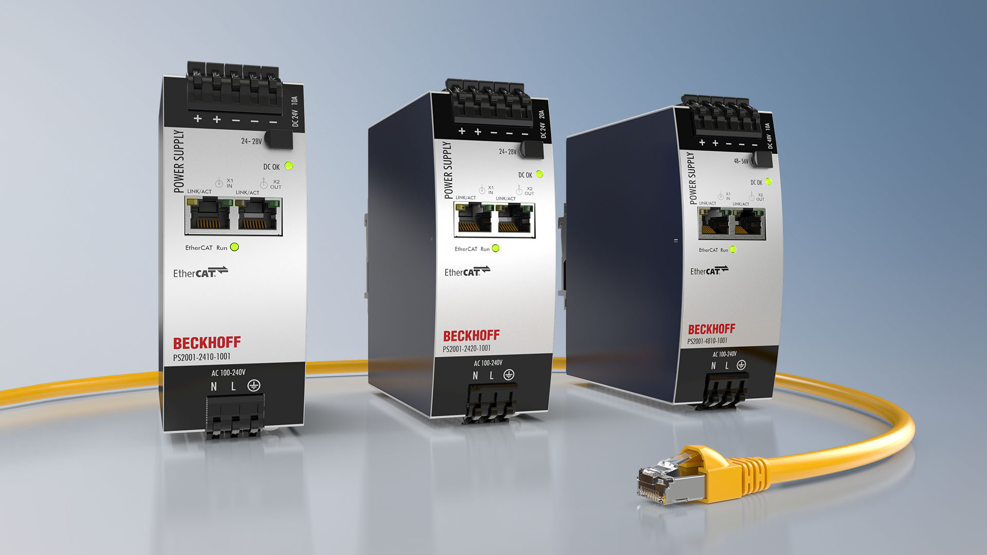 电源 PS2001-4810-1001 是单相 48 V 直流电源并集成 EtherCAT 接口,输出电流为 10 A,输出功率为 480 W。该设备在输入端具有宽幅输入、功率因数校正(PFC)和浪涌电流调节功能。输出根据 UI 特性曲线工作,并在过载/短路时切换到安全打嗝模式。