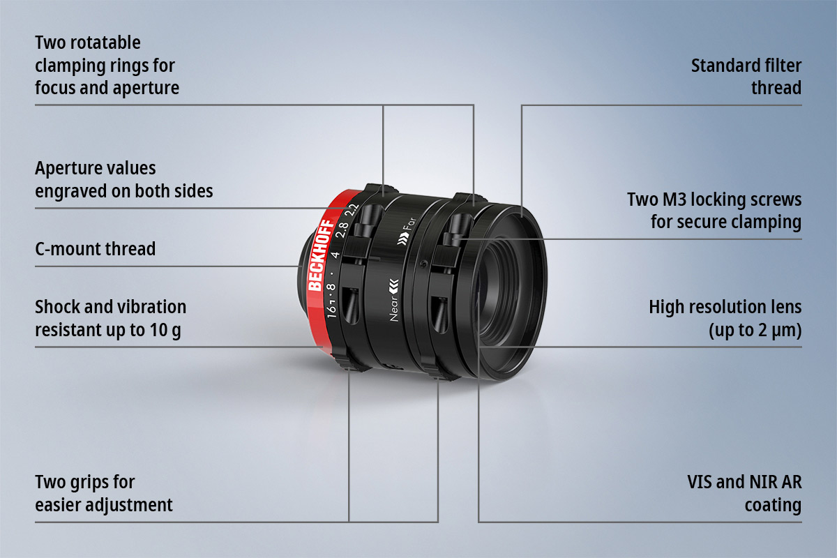坚固的机械设计与可固定的焦距和光圈调节机制确保功能的可靠性和持续性,其中设定的光学参数保持稳定不变,尤其适用于工业生产和极端环境条件。